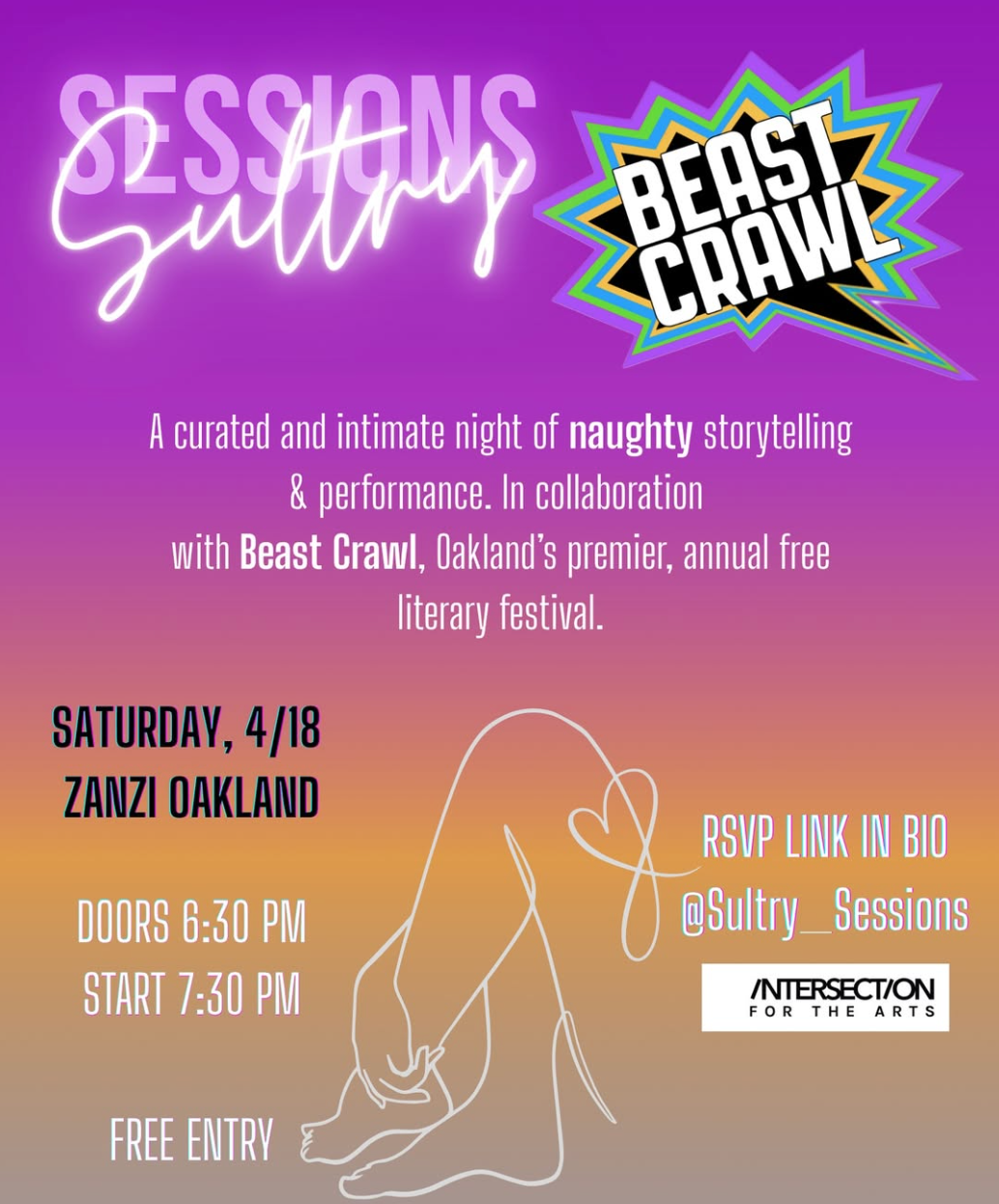 I'm white, and I am in white spaces a lot, and I really liked going to Sultry Sessions being like, Oh, there's a whole scene out there that I'm not a part of, and I'm really curious about that, especially the open mic scene and the invitation of that openness and the history and the culture of that in the Bay Area. I'm also intrigued by thinking about writing that's meant to be performed and experienced aurally. And with an open mic, you have that audience becoming the readers and switching, like you are just all in it together.