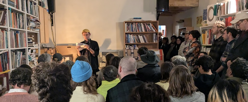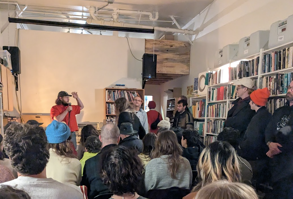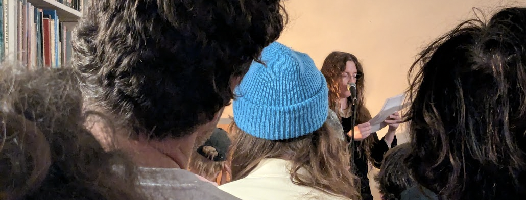 Joni Prince is the first reader; "It’s so cozy in here,” she notices, and reads a 2025 poem with seasons and feelings in it, all of which the crowd loves. What a reader to launch the new year! Our favorite lines: “One can only engage in so much sex and destruction before one begins to engage in an experiment in ‘communal living.’” And “Someone in the 16th century thought it was a good idea for the year to both begin and end with winter. Fuck you, Gregory.” And most importantly, “The purpose of poetry is to launder the truth,” which M quotes back to her when chatting with Joni afterward about the vulnerable and personal nature of the poem, which was intended to be confessional even if it was inevitably tumble-dried.