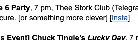 Parapraxis Issue 6 Party, 7 pm, Thee Stork Club (Telegraph). Celebrate the arrival of Issue 6 with the drinking cure. [insta]