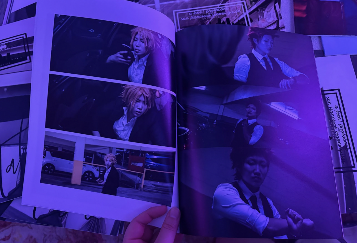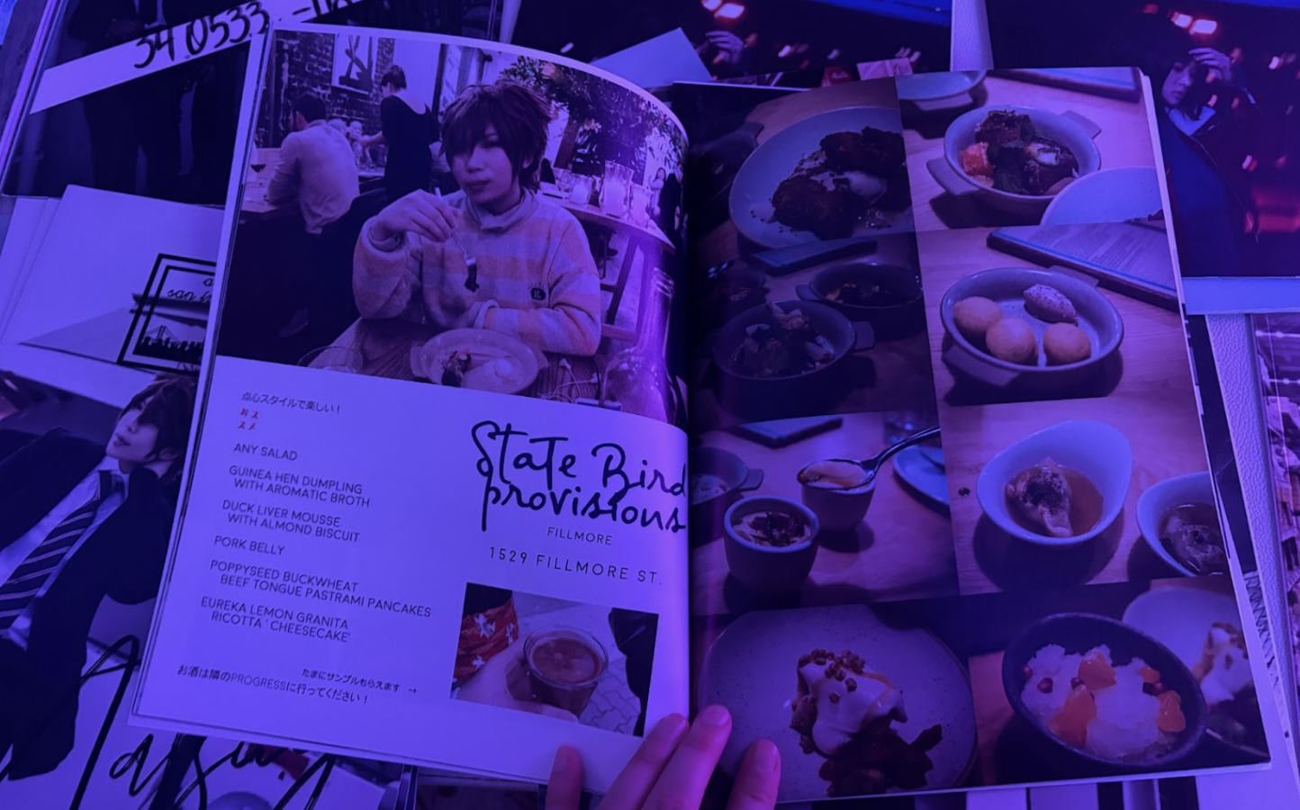 But then, strewn on a couch against a wall, I saw the only thing all night that felt inspired. It was piles of what appeared to be homemade magazines that advertise various places in San Francisco. Each place included a dreamy, anime-style photoshoot featuring the same cosplay-esque individual, an androgynous figure with a spiky wig, incredible bone structure, and a clear love of being photographed. This individual at Land’s End, at Dumpling Time, at Craftsman and Wolves. There was even a magazine with actually good steampunk-anime-noir photos from inside city parking lots. Most of the text was in Japanese.