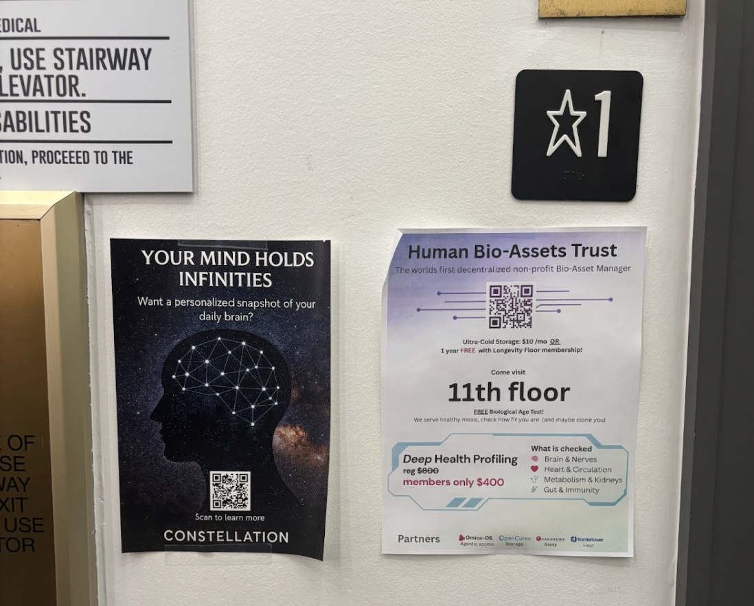 As it happens, I ended up at the densest confluence of contemporary tech signifiers I could’ve hoped to find at Tech Week. It was the Frontier Tower, a “vertical village for frontier technologies” (it’s a co-working space). Though it was immortalized in Kerry Howley’s recent New York Magazine piece, I didn’t make the connection at first. But I started getting keyed up when I saw the longevity flyer near the elevator and had to press one of the buttons on the elevator that advertised things like “Biotech Neurotech” on floor 8 and “Accelerate!” on floor 10.