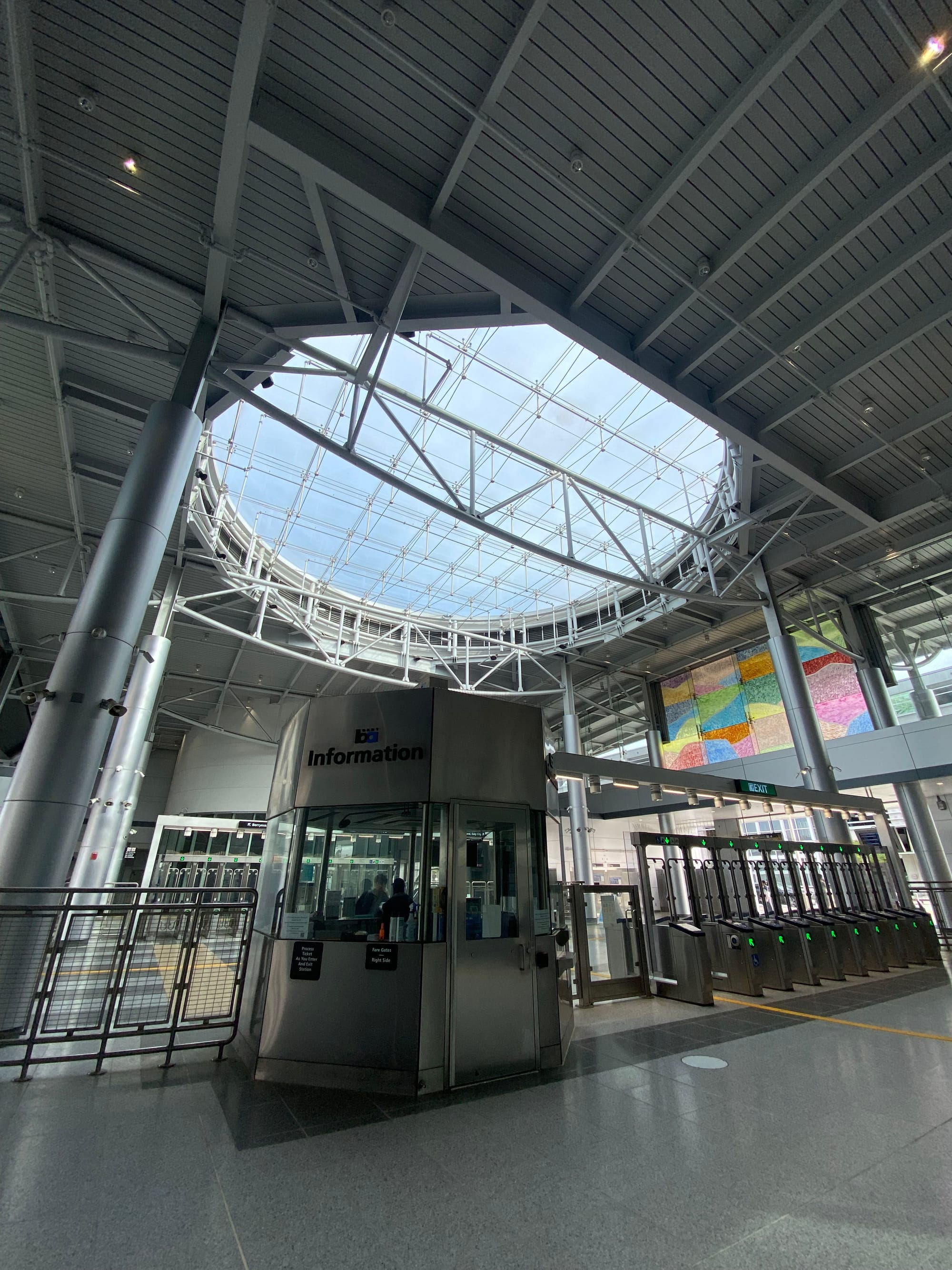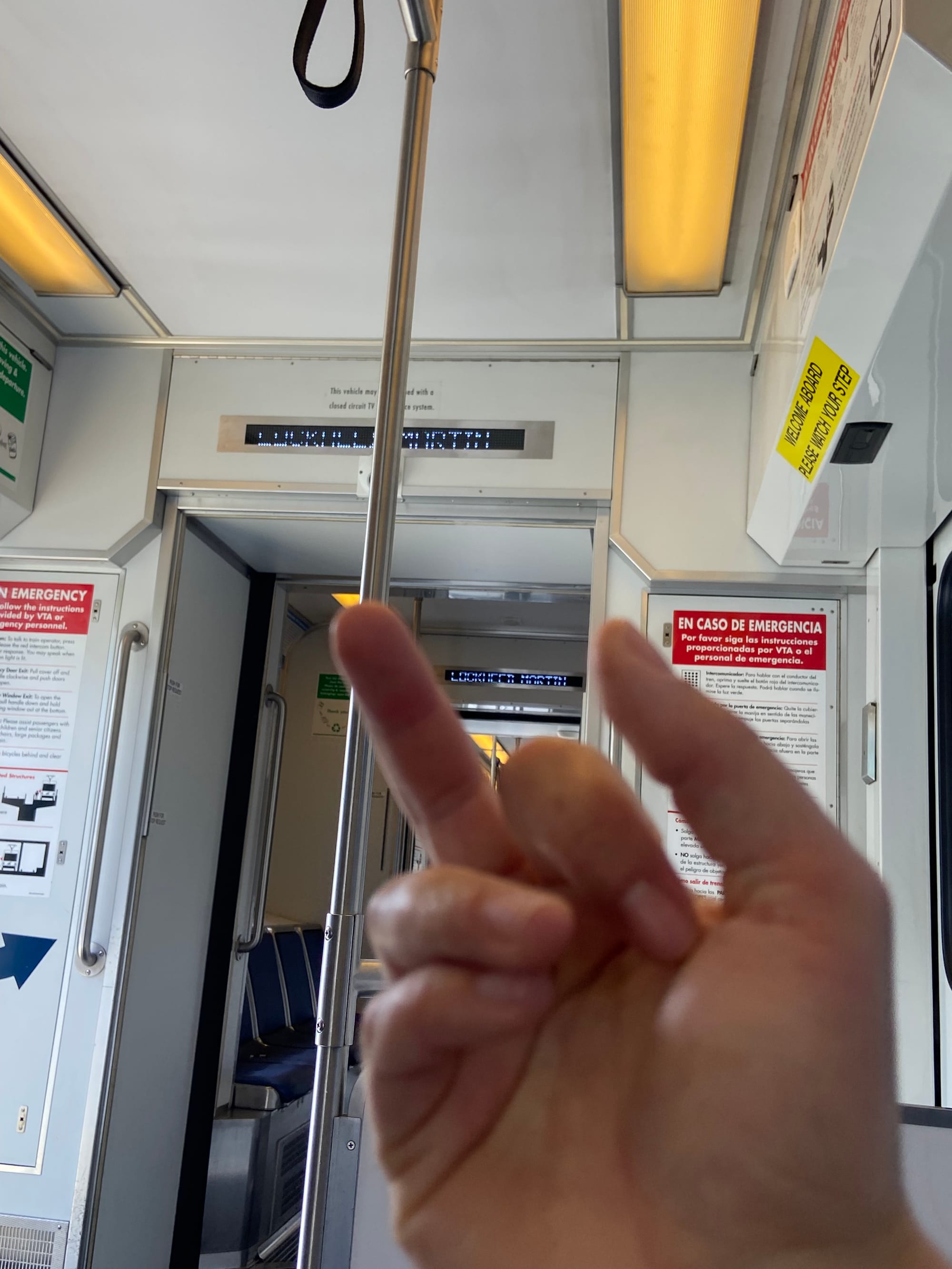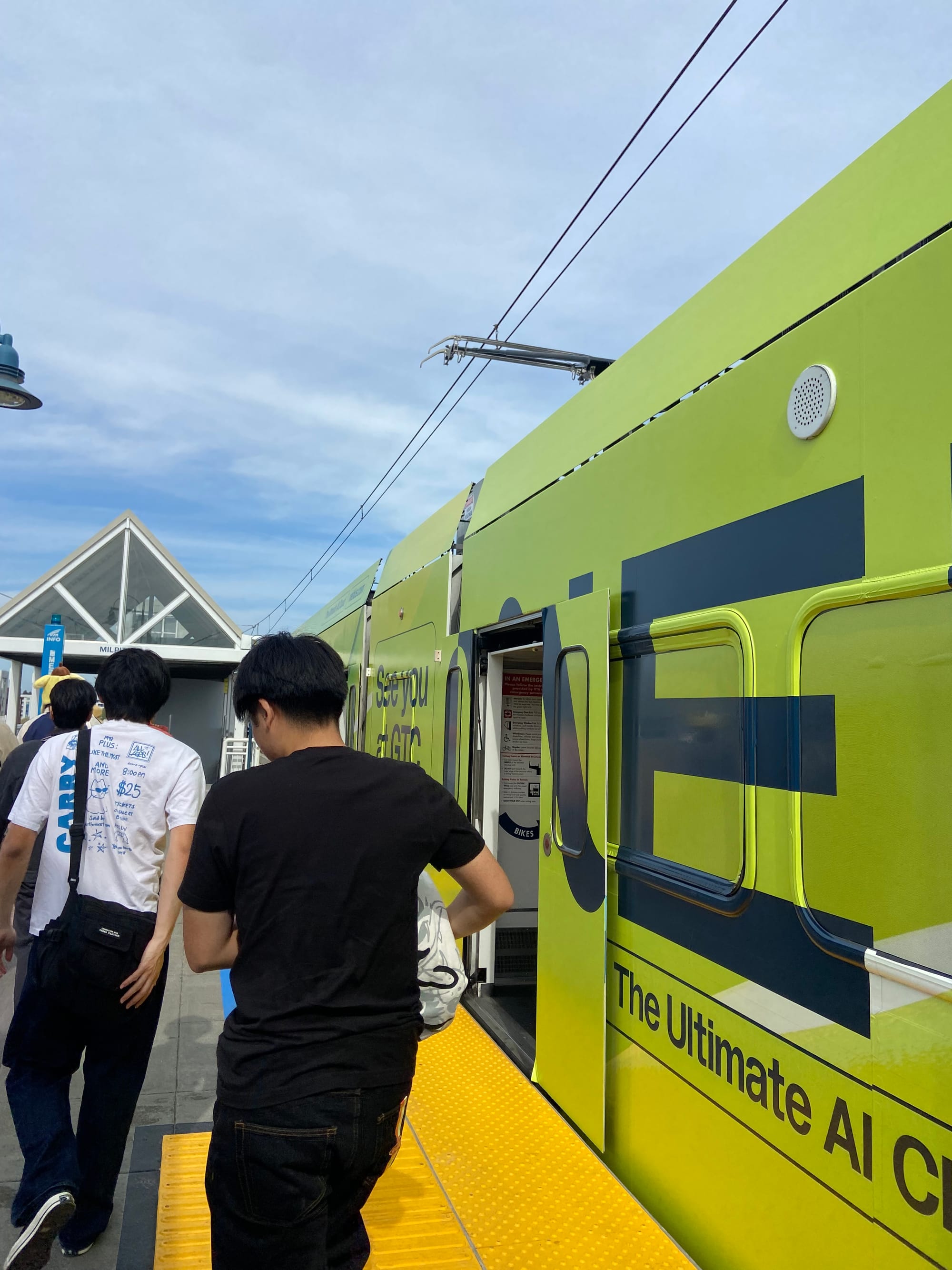 In Milpitas, we disembark into a station that feels like a glass cathedral, color-stained windows and all, the most beautiful BART station I’ve ever seen. We transfer to the Valley Transportation Authority light rail, which serves San Jose and the surrounding areas. I am immediately disappointed to find that both of the little train’s two cars are entirely covered with a wrap-advertisement for some sort of AI service called “supermicro,” which would be cute if it were the name of the train but is unfortunately not cute because it is not. It is the name of an AI service. The wrap distorts our view out the windows, though what I can see looks suburban and office park-y. There is a stop called “Lockheed Martin” that services, you guessed it, a Lockheed Martin facility. We contemplate boo-ing whoever gets off or on there, but nobody does.
