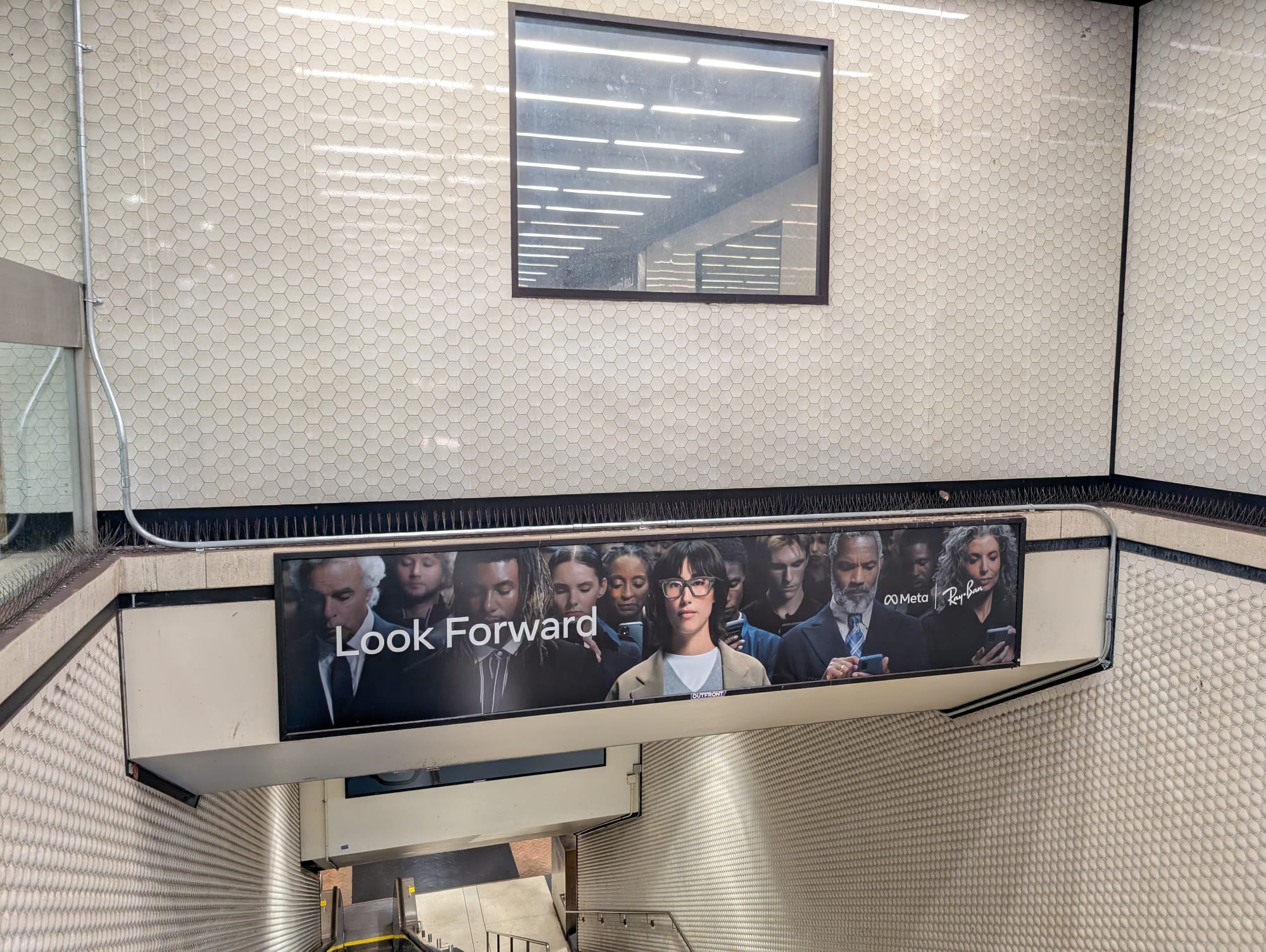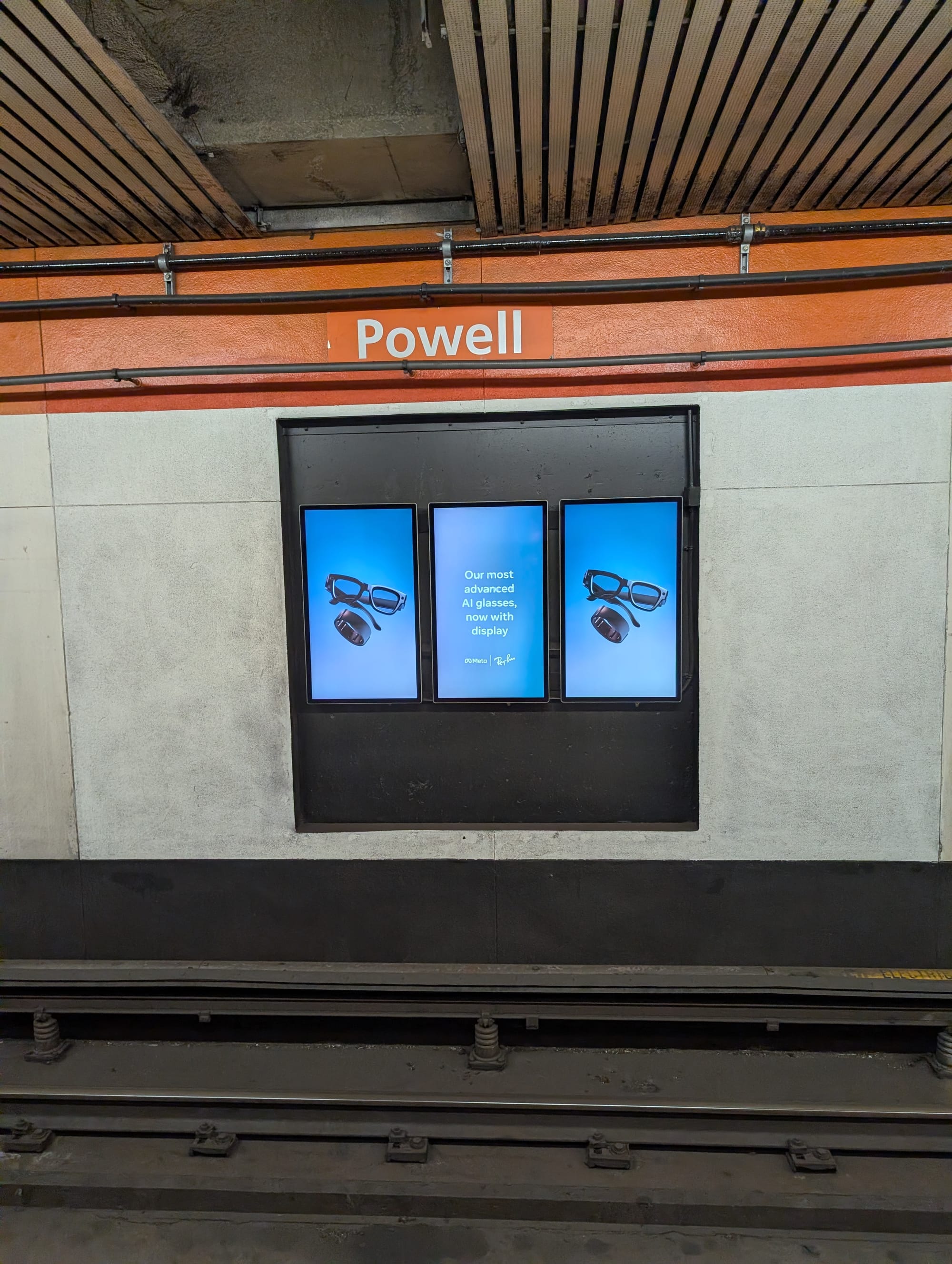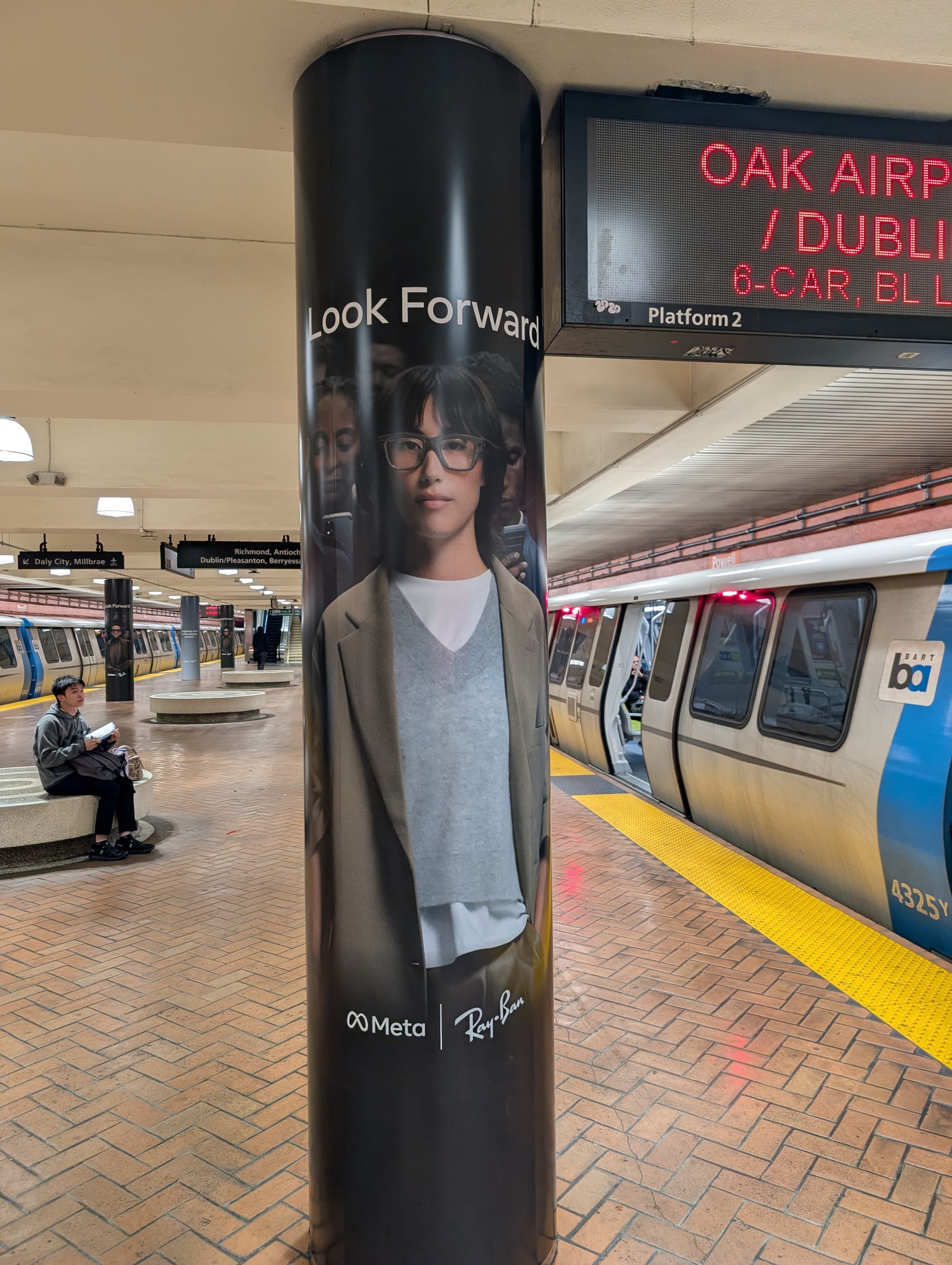 The VPN and Zenni ads mostly had the courtesy to stay on the other side of the BART tracks, but in the Powell Street station, you can't look anywhere and not see Meta trying to sell you their cursed AI Ray-Bans. I made a spectacle of myself, trying to take a picture of all of them, in their massively compressed color spectrum; the reds and yellows of the East Bay have given way to, at most, a blue that just barely pokes its head out of grey.