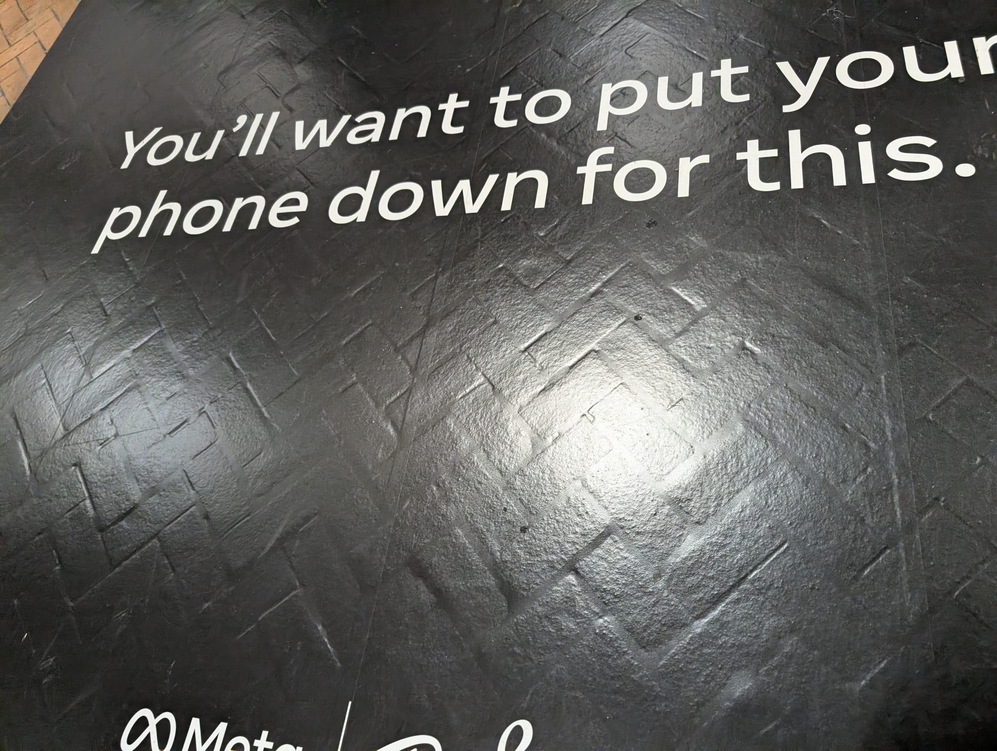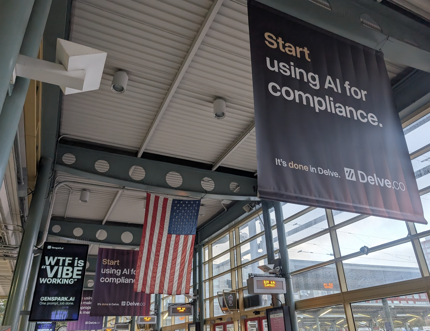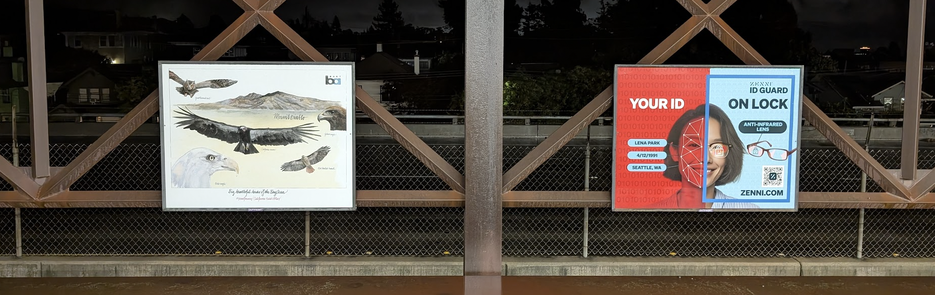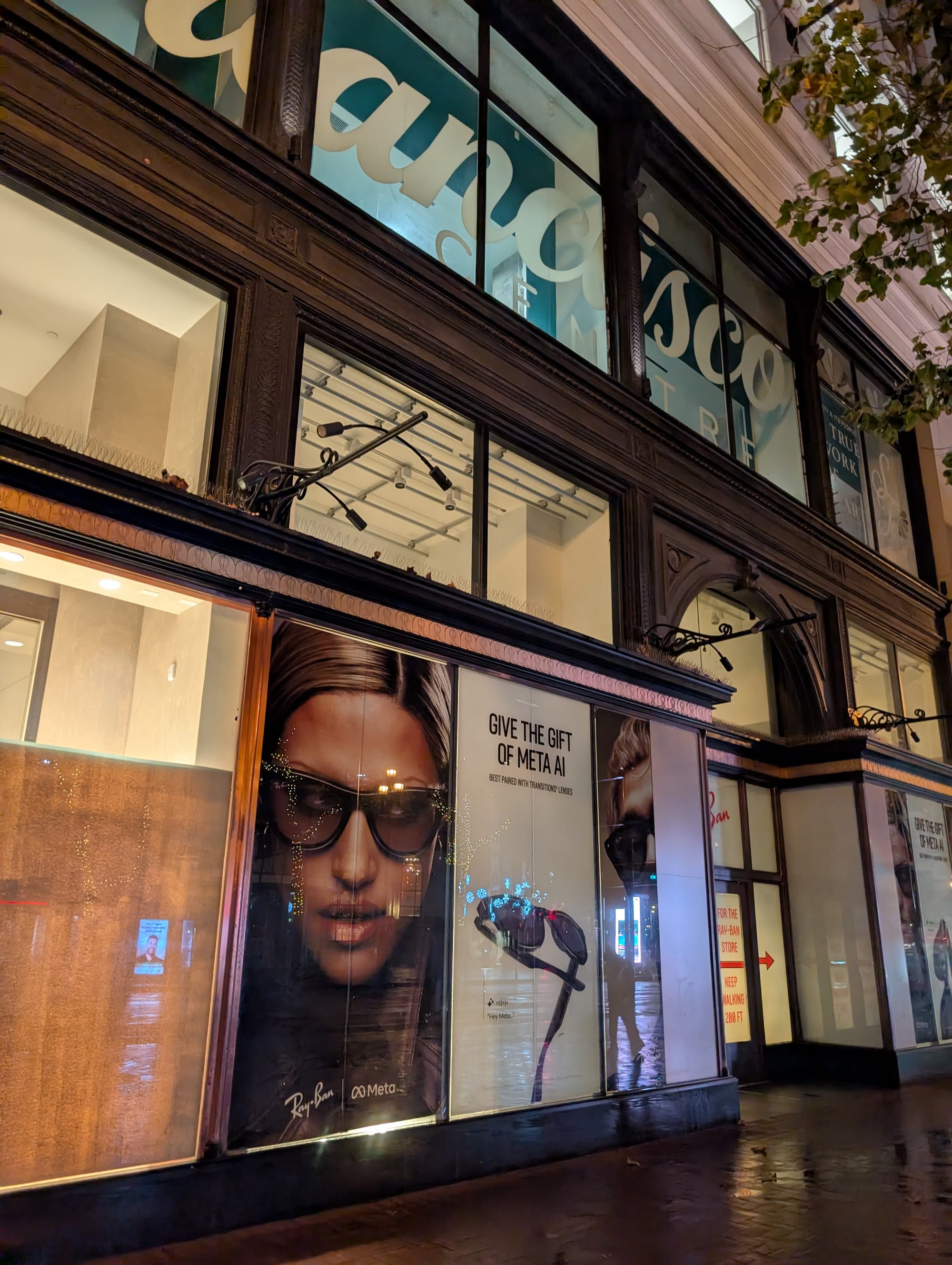 The VPN and Zenni ads mostly had the courtesy to stay on the other side of the BART tracks, but in the Powell Street station, you can't look anywhere and not see Meta trying to sell you their cursed AI Ray-Bans. I made a spectacle of myself, trying to take a picture of all of them, in their massively compressed color spectrum; the reds and yellows of the East Bay have given way to, at most, a blue that just barely pokes its head out of grey.