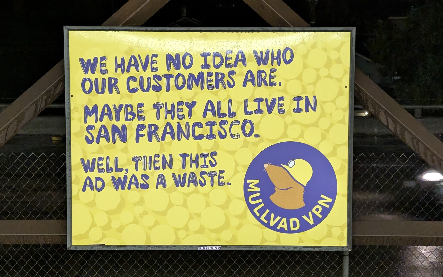 It can be nice that at least these ads know they're selling to people who want protection from Big Tech. At least selling us little tech, in response, isn't the alienated confusion of looking up at whatever B2B insanity is currently glaring down at the 80. At least they are trying to get our buy-in. At least on some level they think they need it.