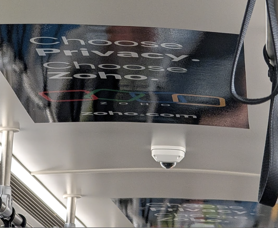 There's something about the medium and the message, here, or at least about how omnipresent the freedom from being surveilled is, everywhere you look: On the train, the ceiling looks down at me and yells CHOOSE PRIVACY (through cloud-based business software).