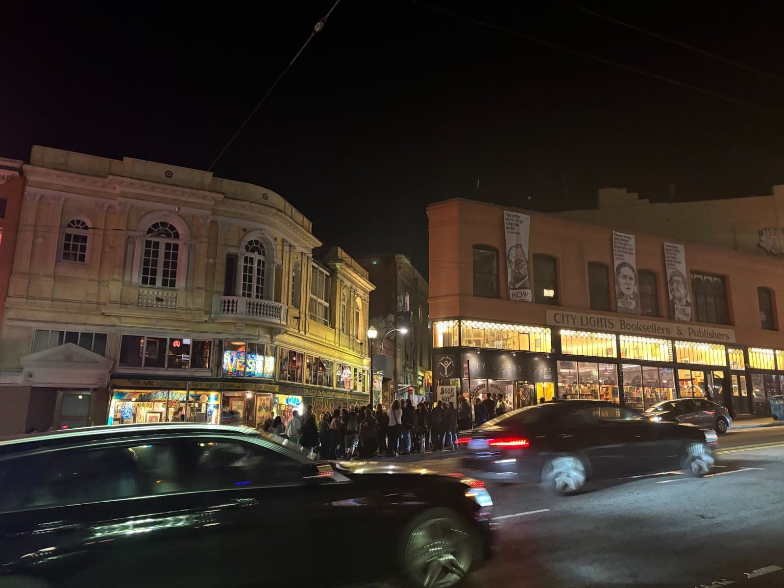 On the way out, a “late-stage founder” and an enterprise something or another exchanged information with me, commenting on how unexpectedly slow the elevator was. I regretted my anxious abandonment of the initial event, and walked my way up Columbus in search of more food. I could hear some very loud music and it occurred to me that a punk show was happening in Kerouac Alley. A throng of people filled the alley and the sidewalk in front of City Lights and Vesuvio. I ducked into Tosca Cafe. The vibes were slightly off–only one server was on the floor and the only other guests were large parties of what seemed like groups of colleagues–but it brought me back into the register of the everyday. Or rather, I left one Bay Area bubble and dropped back into my usual one.—Annie Lloyd