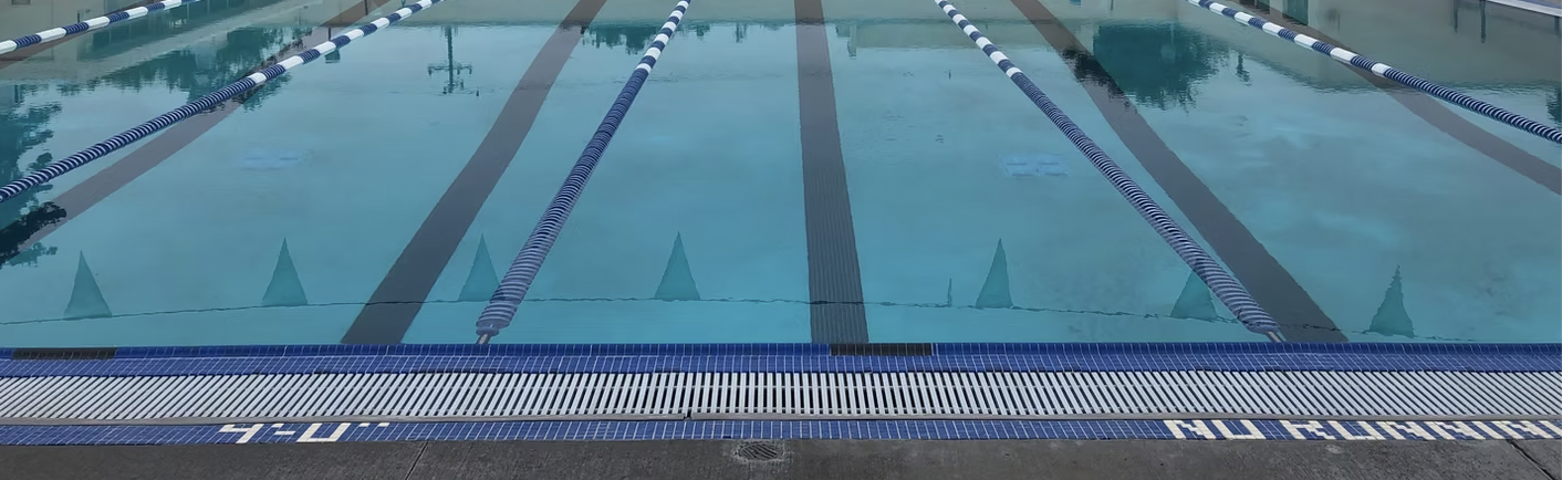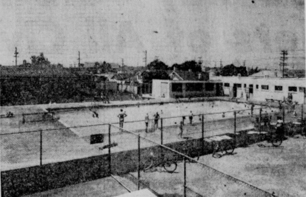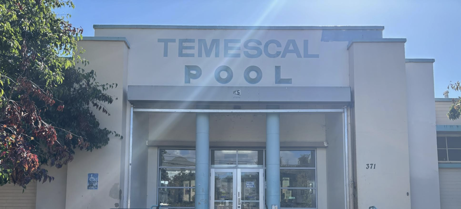 The boxy pool building looks like an extension of the nearby high schools; it’s a simple, angular structure with two columns, light blue accent paint, and TEMESCAL POOL in all caps over the front doors. The building is a facade, though; the pool itself is outdoors. Gates and hedges contain the pool area, which includes the surrounding concrete and a small grassy area.